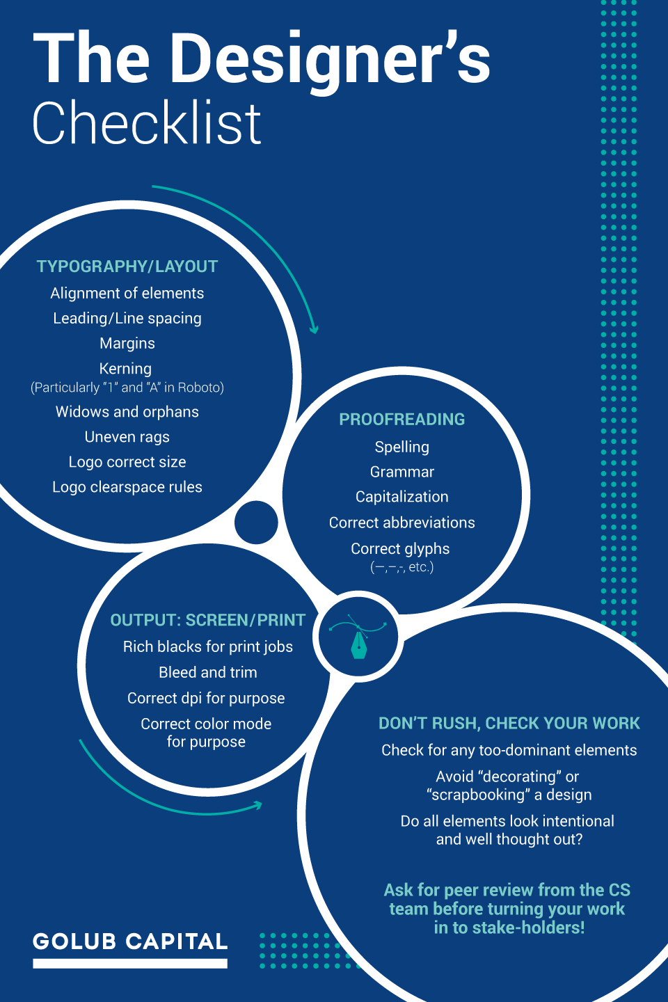 Project: Along with another designer, I was challenged by senior leaders to create a Designer's Checklist to be printed and referred to for our Creative Services team at Golub Capital.